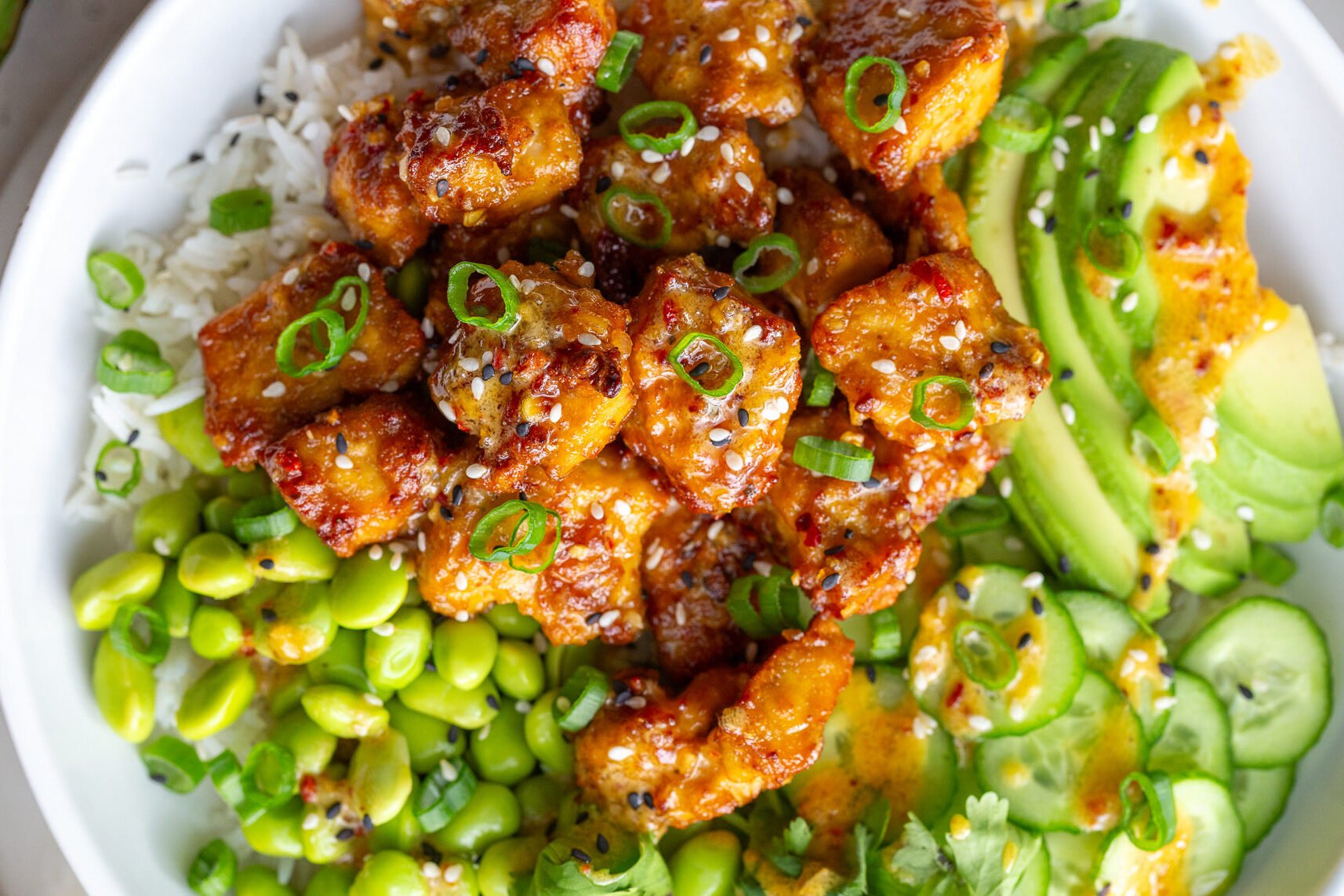 Chili Crunch Tofu Bowls are flavorful and filling with the perfect amount of spicy kick. Each bite is packed with incredible texture—from crispy tofu and crunchy fresh cucumbers to creamy avocado and hearty grains. Just what you need to shake up your weekly menu!