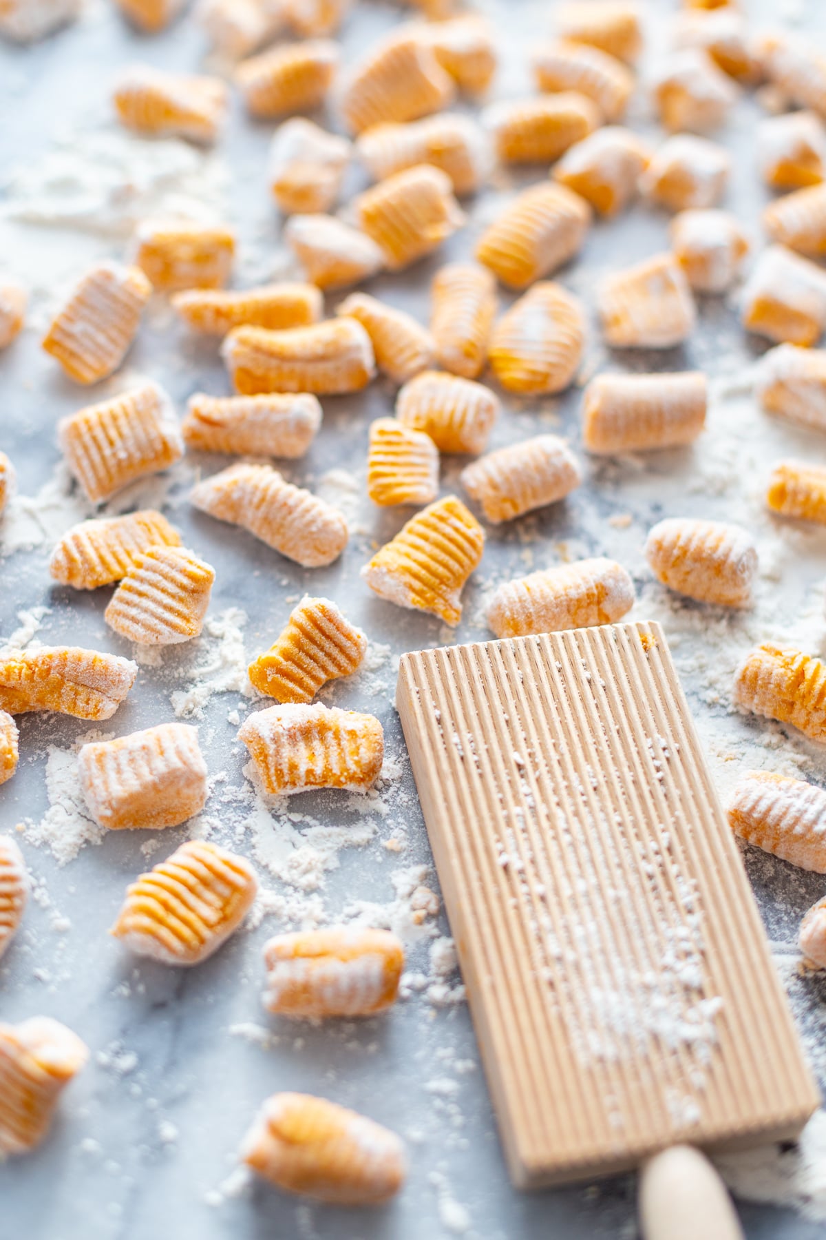 - Optional: using a gnocchi board to roll each piece and create grooves for the sauce to stick. You can also do this by simply pressing the back of a fork into 2 sides to create the grooves.