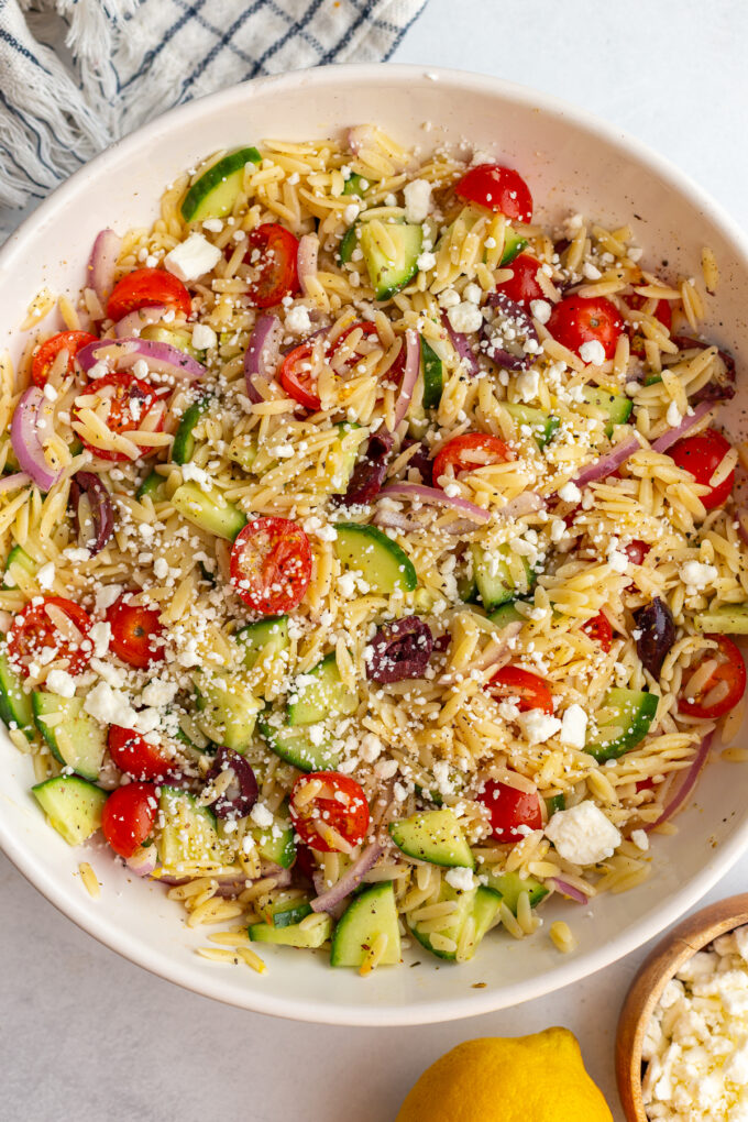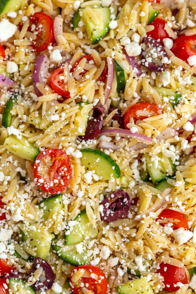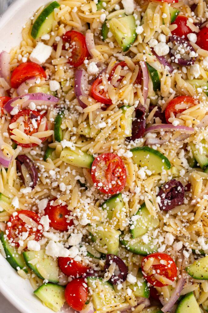 - Add the orzo to a large bowl. Add in the cucumber, tomatoes, red onion, and olives. Mix to combine. Add on the dressing and toss to combine thoroughly. Toss in the feta cheese and enjoy! Store leftovers in an airtight container.