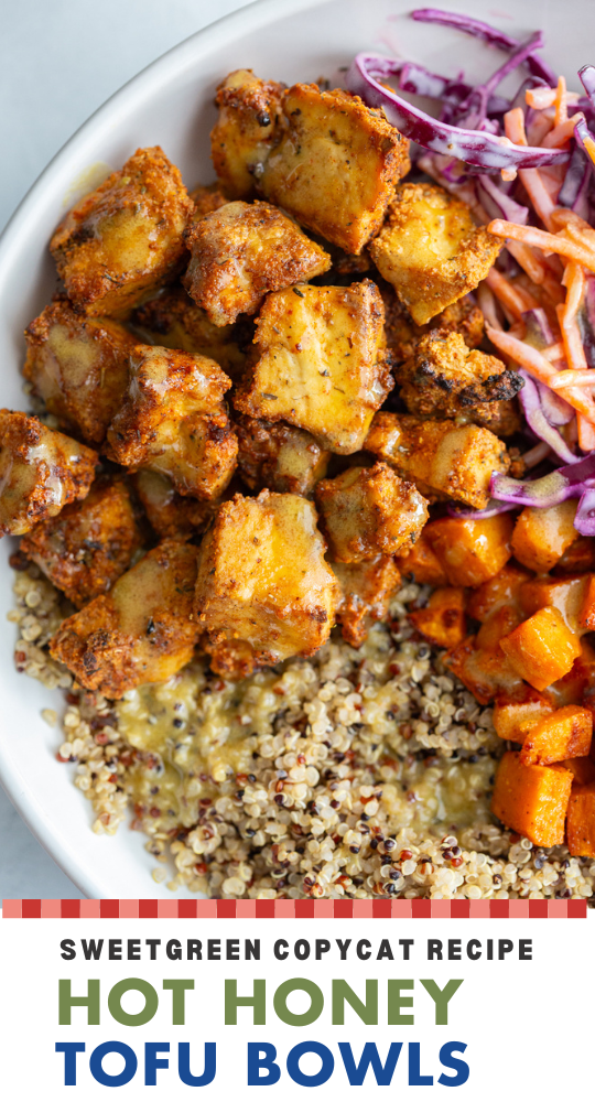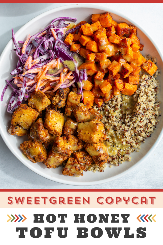 If you’ve seen the viral Sweetgreen hot honey chicken bowl, this is my vegetarian spin – and honestly, it might be even better. Crispy tofu, sweet roasted potatoes, crunchy slaw, and that sweet-spicy honey mustard situation… it’s a full-on flavor moment!
