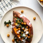 When ready to serve, cut the center of the potatoes open and mash the inside. Divide the chickpea mixture evenly among the potatoes. Season with additional salt and pepper as needed and ENJOY!