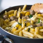 Combine the broth, white wine, and cream in the skillet and then add in the pasta. Bring to a boil and then lower to a simmer for about 6 minutes. Add in the squash and continue to simmer for an additional 8-10 minutes until both the pasta and the squash are just barely tender.