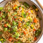 Add the stir fry sauce and cook for a couple of minutes until it begins to thicken. Add in the noodles and toss so that everything is coated in the sauce.