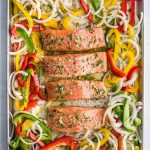 Place the peppers and onion on your baking tray and toss together with 1/3 of the marinade. Make space in the center or on the side of the tray and place the salmon fillets. Top with another 1/3 of the marinade. Bake for 12-15 minutes or until salmon is cooked through.