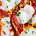 Spoon the remaining marinara sauce on top of the shells. Place the slices of mozzarella evenly around the top of the shells.