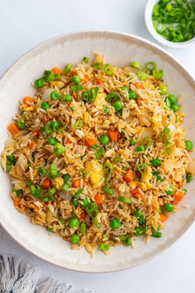 vegetarian fried rice in a large white bowl