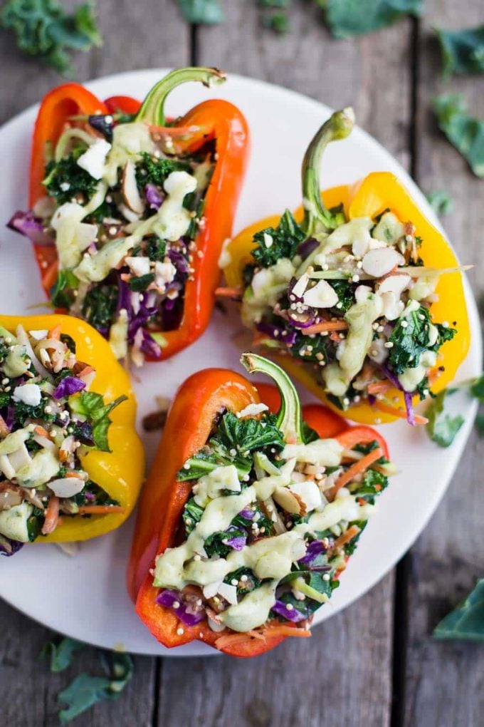- Right before scooping the salad mixture into the peppers, stir in half of the cheese and half of the almonds and half of the avocado dressing.
